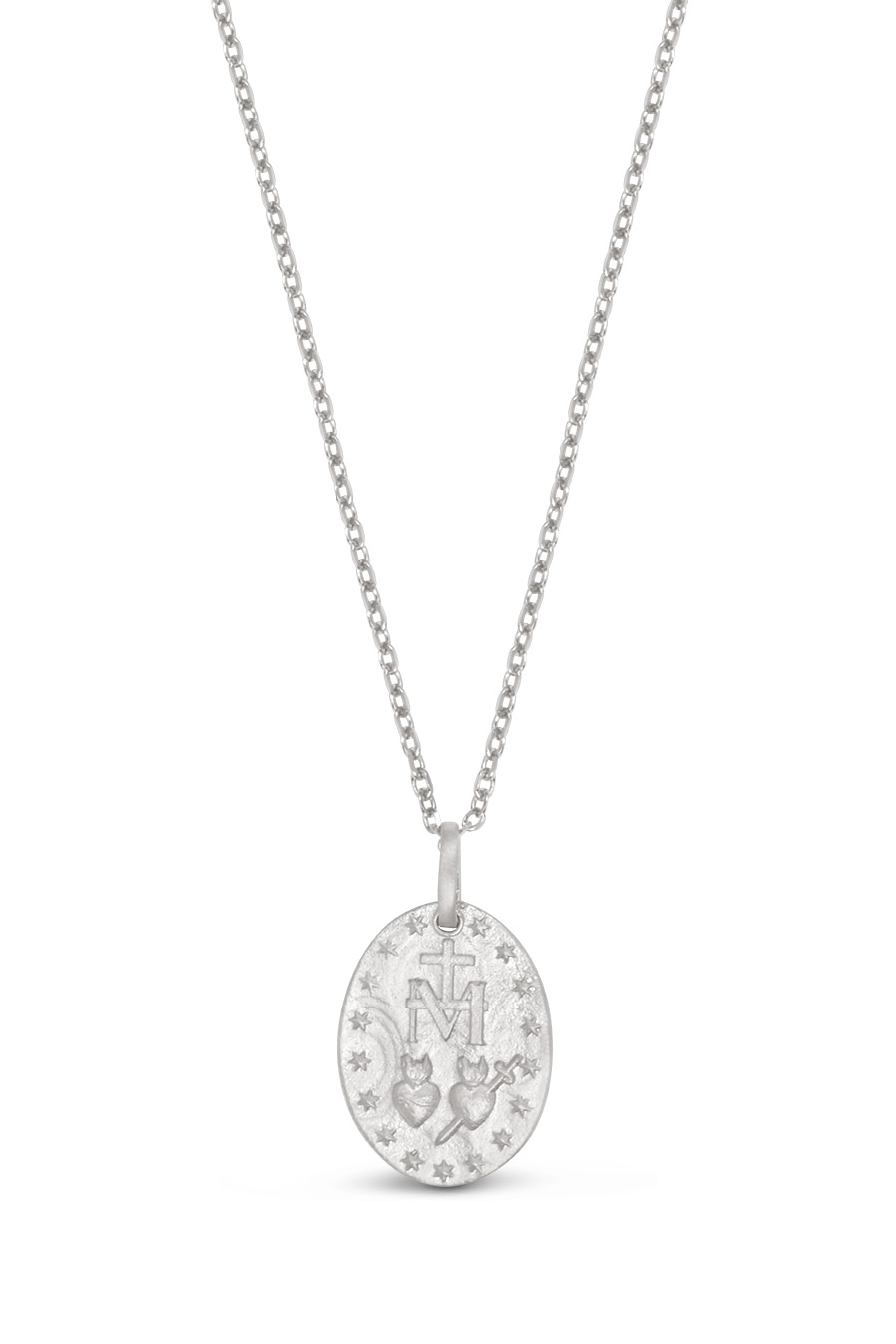 Dans la collection Amour Céleste, le collier mini médaille miraculeuse se pare de 3 mini zircons et d’une matière mate rappelant les bijoux d’époque. La modernité et l’ancien s’harmonisent parfaitement pour nous protéger et nous apporter espoir et amour. Il peut faire office d’un cadeau pour les baptêmes ou communions ou se porter au quotidien en association avec d’autres médailles. Il existe aussi en plaqué or.