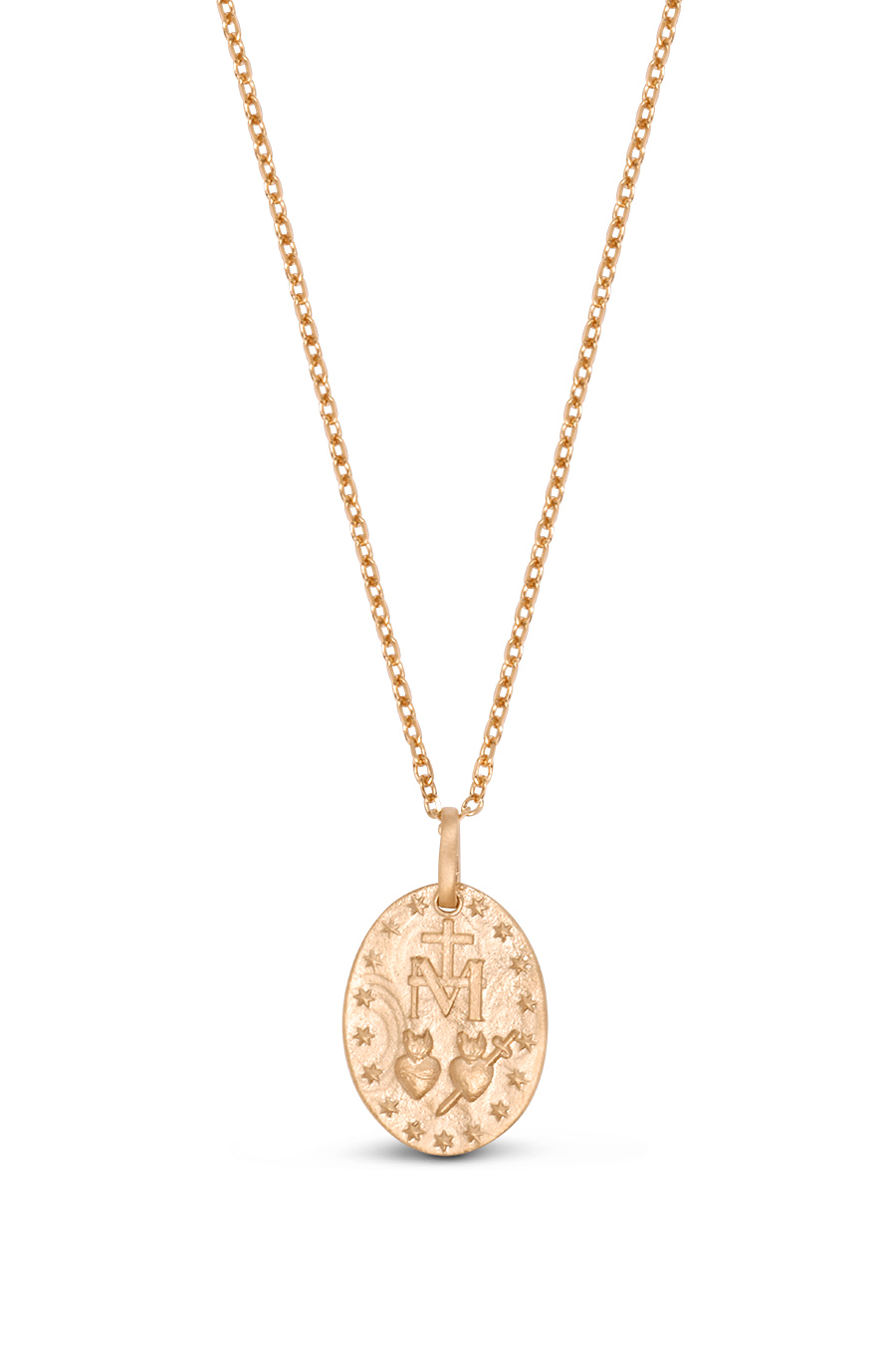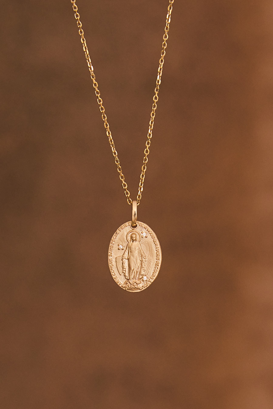 Dans la collection Amour Céleste, le collier mini médaille miraculeuse se pare de 3 mini zircons et d’une matière mate rappelant les bijoux d’époque. La modernité et l’ancien s’harmonisent parfaitement pour nous protéger et nous apporter espoir et amour. Il peut faire office d’un cadeau pour les baptêmes ou communions ou se porter au quotidien en association avec d’autres médailles. Il existe aussi en argent 925.